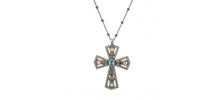Cadena de plata de la que cuelga una cruz repleta de piedras semipreciosas, circonitas y detalles con una piedra semipreciosa en el centro.