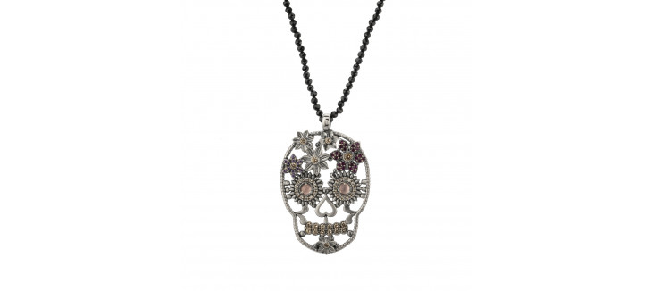 Este colgante te transportará directamente a la cultura mexicana por su originalidad, sus detalles y sus colores. Una cadena de ónix pequeño de la que cuelga una calavera repleta de detalles de plata con piedras semipreciosas y circonitas que le dan un toque único.