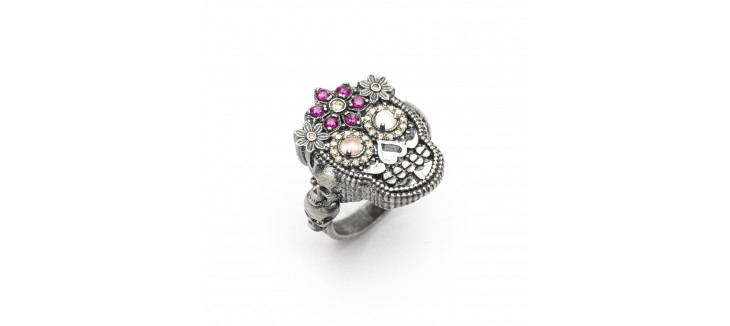 Anillo calavera plata grande. Engastado con piedras semipreciosas.