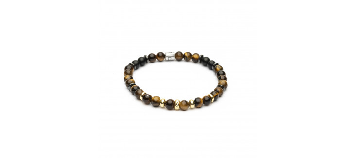 Pulsera de plata de primera ley (925) chapada en oro de 18kt, ojo de tigre y ónix negro mate en bola.