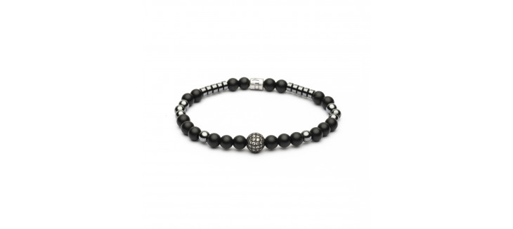 Pulsera de plata de primera ley (925)con hematite brillo, circonita blanca y ónix negro mate en bola.